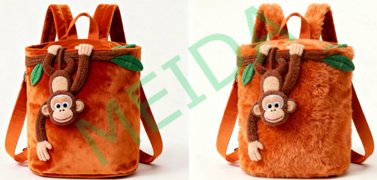 Hanging Monkey Backpack Duo features velvet and plush backpacks designed around a playful monkey hanging from a tree branch. Nature-inspired details, bucket-style structure, and export-ready production support OEM ODM character backpack programs.