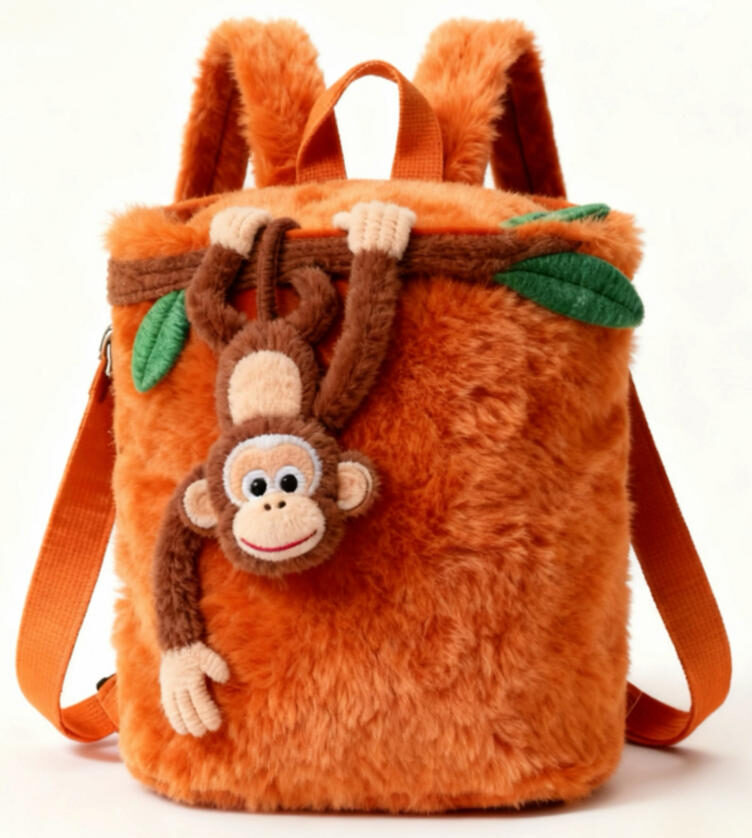 The Hanging Monkey Jungle Backpack is a plush monkey backpack designed as a playful and practical daily item for children.The soft plush surface and warm jungle-inspired color palette create a friendly appearance that suits kids’ products, gift collections, and animal-themed displays. Its compact shape allows easy carrying while still offering enough space for small personal items used during daily activities.