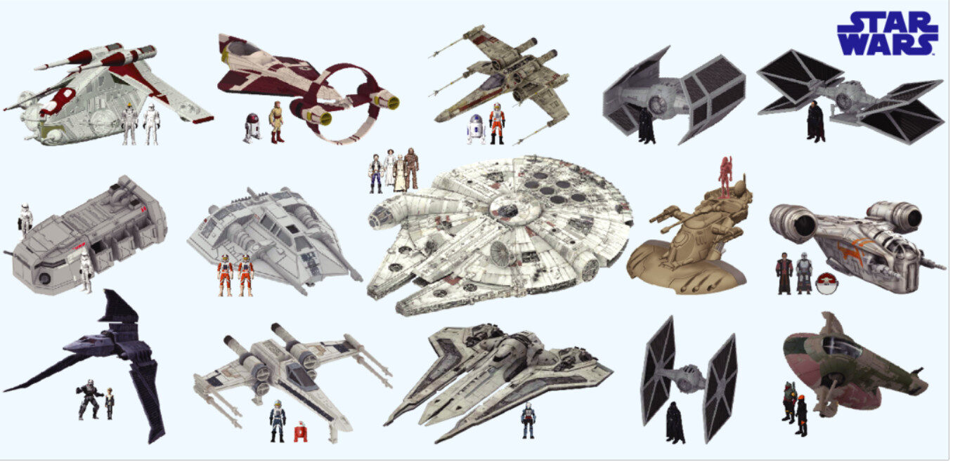 Sci-fi space vehicle collection designed for character display, themed retail, and OEM collectible production with multiple ship styles.